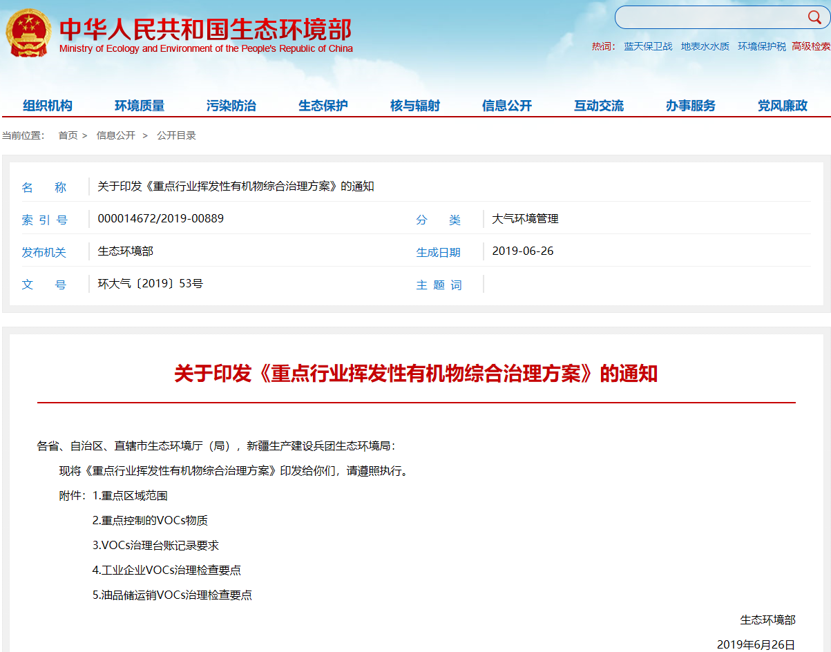 环境部印发《重点行业挥发性有机物综合治理方案》